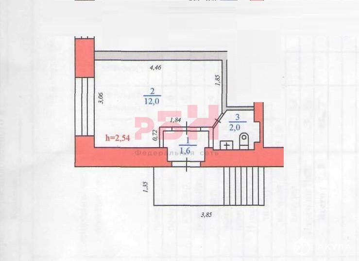 - высота потолка 2, 54 м